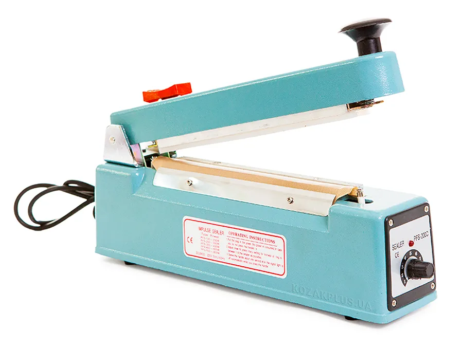 Електричний зварювач пакетів PFS200C - ручний настільний зварювач полімерної плівки з механічною обрізкою. Зварювач призначений для зварювання пакетів та мішків (формування шва) з різних плівок - поліетиленової, поліпропіленової плівок, а також ламінованого паперу в процесі виготовлення різних виробів з термозварюваних матеріалів для пакування товарів.