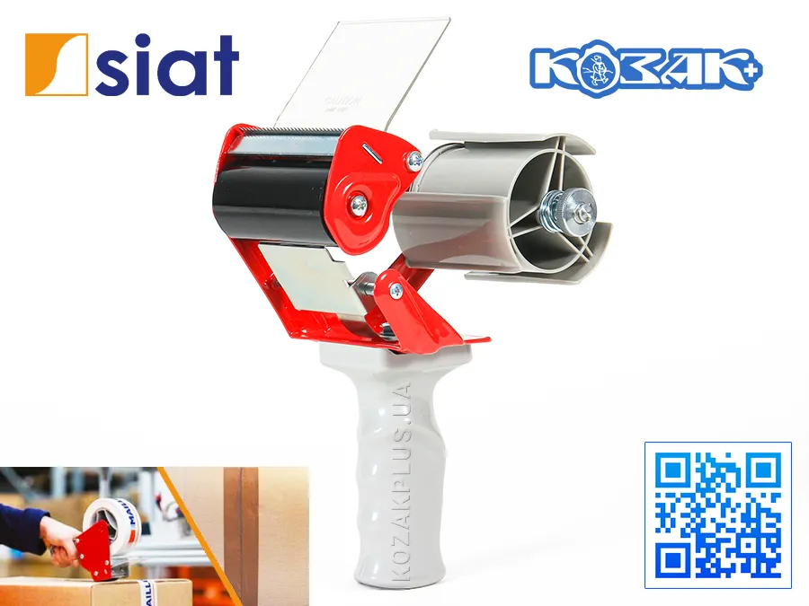 Диспенсер для скотча H133CP – розмотувач клейкої пакувальної стрічки з пластиковою рукояткою. Дозволяє максимально підвищити продуктивність праці при мінімальних матеріальних витратах при ручному пакуванні. Виробництво компанії SIAT S.p.A., Італія.