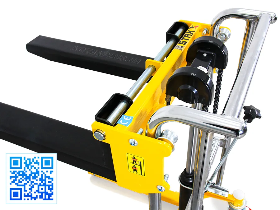 Штабелер Staxx PS400-850 - ручний гідравлічний штабелер з регульованими вилами та платформою для вивантаження товарів на стелажах у логістичних центрах, складах, на підприємствах. Міцна металева конструкція щогли забезпечує вантажопідйомність до 400 кг. Легке керування важелями спрощує використання, дозволяючи працювати штабелером людям без спеціальних навичок. Виробництво компанії Staxx, Китай.