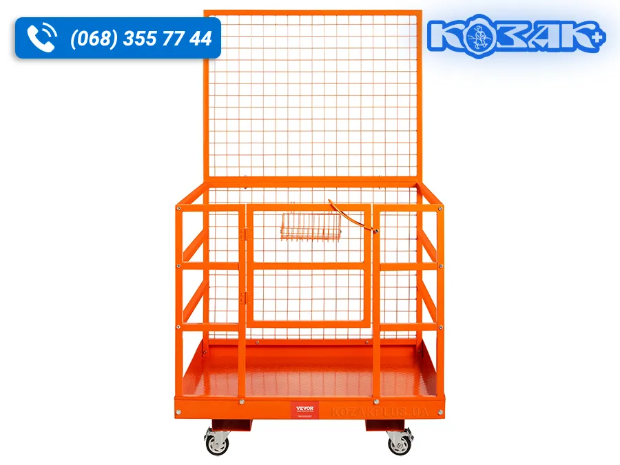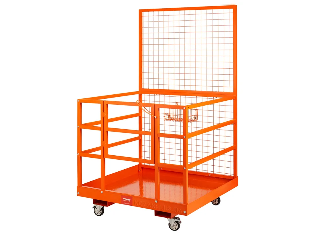 Платформа виготовлена з міцної сталевої конструкції з порошковим фарбуванням, оснащена захисними огорожами з металевої сітки, протиковзким піддоном і високою задньою спинкою для захисту оператора. Передбачені отвори для вил навантажувача та система фіксації до щогли, що забезпечує стабільність і безпеку під час роботи.